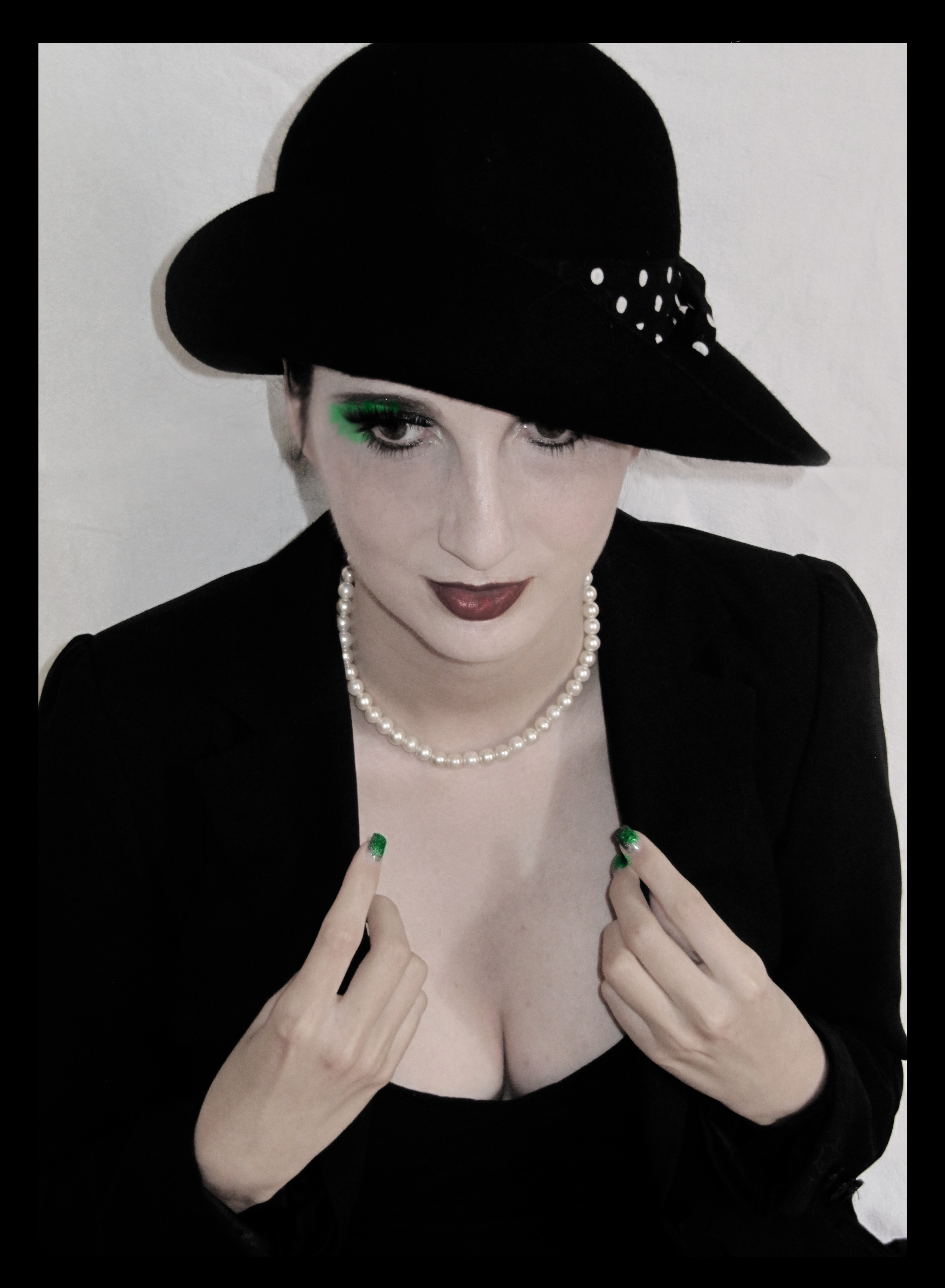 Das Bild ist schwarz umrahmt und wirkt insgesamt beinahe schwarz-weiß, obwohl es das nicht ist. Es zeigt eine junge Frau mit einem schwarzen Filzhut. Sie trägt den runden Hut mit  der breiten Krempe leicht schräg auf dem Kopf. Dazu hat sie einen schwarzen Blazer und ein tief ausgeschnittenes schwarzes Top an. Sie ist bis zur Taille zu sehen. Ihre Haut ist sehr blass, fast so weiß wie die Wand vor der sie steht. Als einzige Farbflecke sind die Fingernägel und der Lidschatten in Smaragdgrün zu sehen, und der rotgeschminkte Mund. Das Grün wirkt künstlich, es scheint in der Realität nicht so ausgesehen zu haben sondern ist mit dem Computer hinzugefügt worden. Dadurch bekommt das Bild insgesamt etwas Ikonenhaftes, aber auch etwas Distanziertes, Unwirkliches.