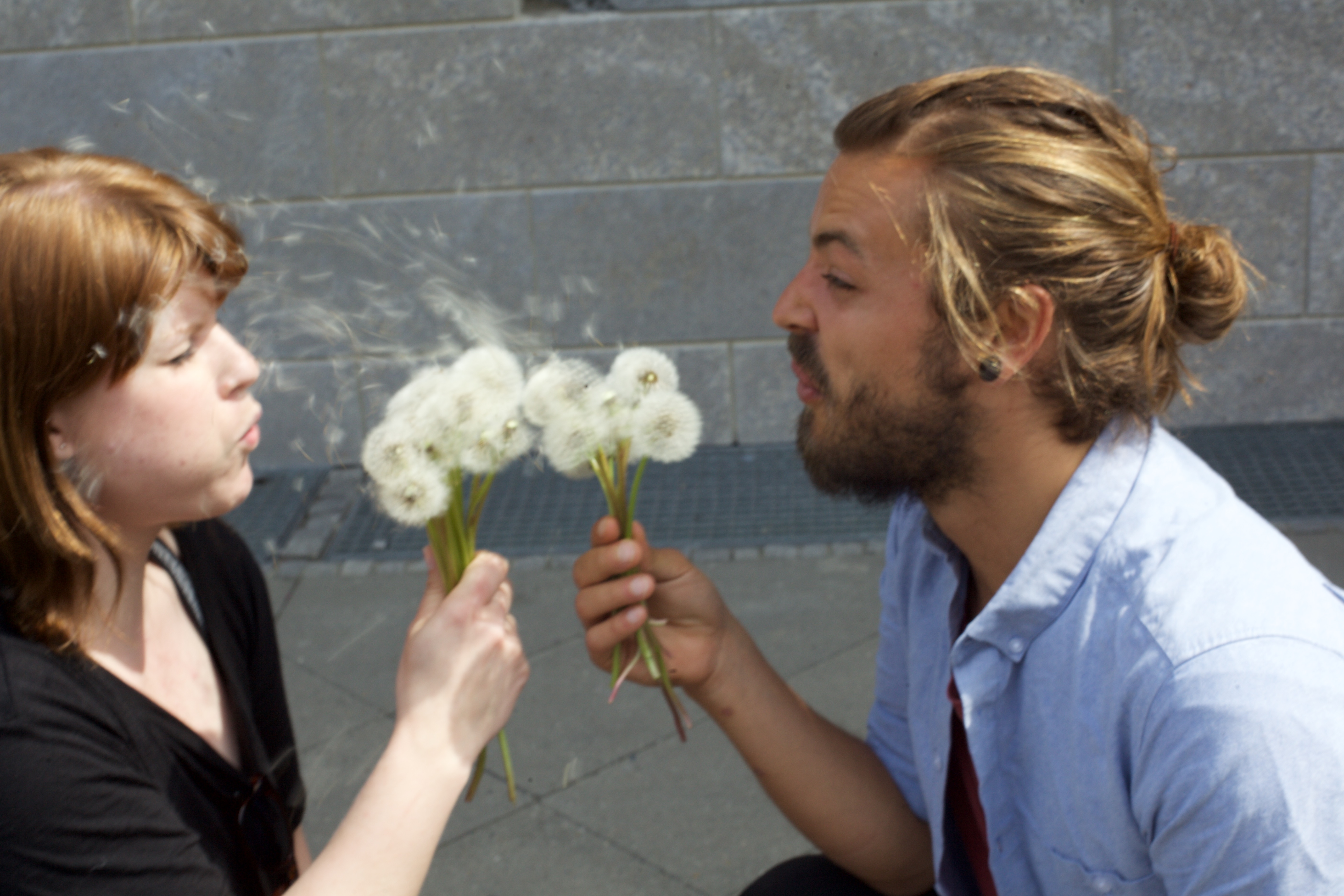 Auf dem Foto befinden sich Anja und Flo die sich gegenüberknien, während sie jeweils einen Strauß Pusteblumen vor sich in der Hand halten. Beide sind im Profil zu sehen. Anja trägt ein schwarzes Langarmshirt mit einem V-Ausschnitt. Die Ärmel sind dabei aufgekrämpelt. Ihr Kopf mit hellen, schulterlangen Haaren ist nur zur Hälfte im linken Bildabschnitt zu sehen. Der Hinterkopf ist gar nicht zu sehen. Anja ist auf dem Foto ab Brusthöhe abgebildet. Sie sitzt auf der linken Seite und hält ca. 7 Pusteblumen in ihrer rechten Hand, die Sie mit ihrer ganzen Hand umfasst, wobei man ihren Handrücken sieht. Sie pustet mit luftgefüllten Wangen eher zarghaft gegen die Pusteblumen, ihre Augen kneift sie dabei zusammen.