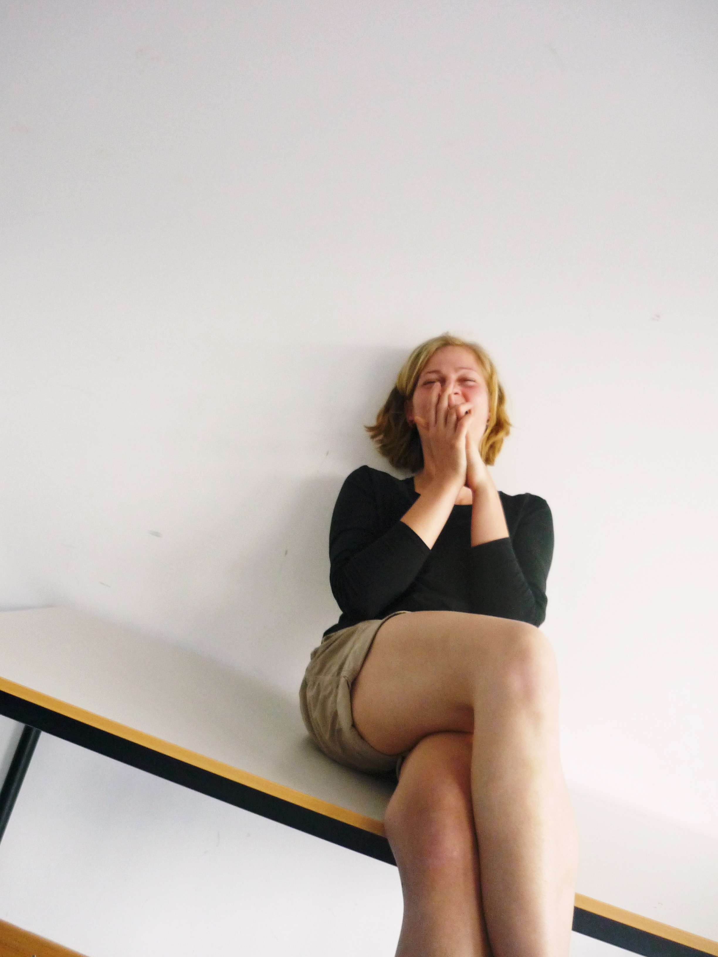 Auf dem Bild ist zu sehen, wie Julia auf einem weißen Tisch, mit brauner Tischkante und schwarzen Tischbeinen sitzt. Julia sitzt mit überschlagenen Beinen mittig auf der Tischplatte. Sie trägt eine kurze beige Hose und einen schwarzen Pullover. Ihre Beine sind nur bis zu den Schienbeinen zu sehen. Ihr Oberkörper ist nach hinten links gebeugt und ihre Arme sind eng an ihren Körper angewinkelt, mit ineinander gelegten Händen vor ihrem Gesicht. Ihr Kopf ist hinter den Händen nur halb zu erkennen. Ihre kinnlangen blonden Haare fallen etwas nach links. Die Augen sind zusammengekniffen und man kann an ihren gehobenen Wangen erkennen, dass sie herzlich am lachen ist.