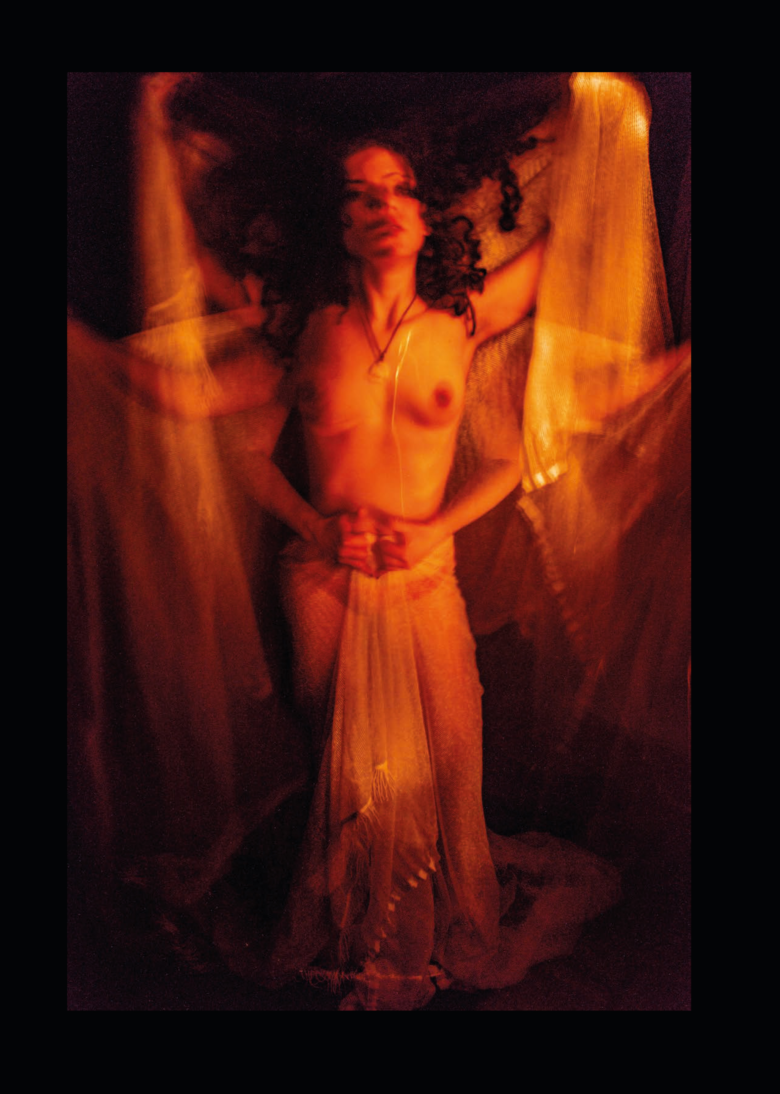 Eine junge Frau mit langem lockigem Haar, das Kinn selbstbewusst erhoben, fest auf dem Boden stehend und unbekleidet bis auf einen Schleier. Diesen hält sie in drei oder vier verschiedenen Positionen, so dass sich der Eindruck ergibt, sie habe sechs bzw acht Arme. Am prägnantesten ist die mittlere Position, in der sie den Schleier fest, mit beiden Fäusten vor ihrem Nabel zusammenhält. Die weiteren Positionen ihrer Arme sind seitlich, auf unterschiedlicher Höhe, aber immer symmetrisch. Die sich an ihren Seiten überlagernden, teilweise durchsichtig wirkenden Phasen des ausgebreiteten Schleiers könnte man aus der Ferne auch für Engelsflügel in Bewegung halten.