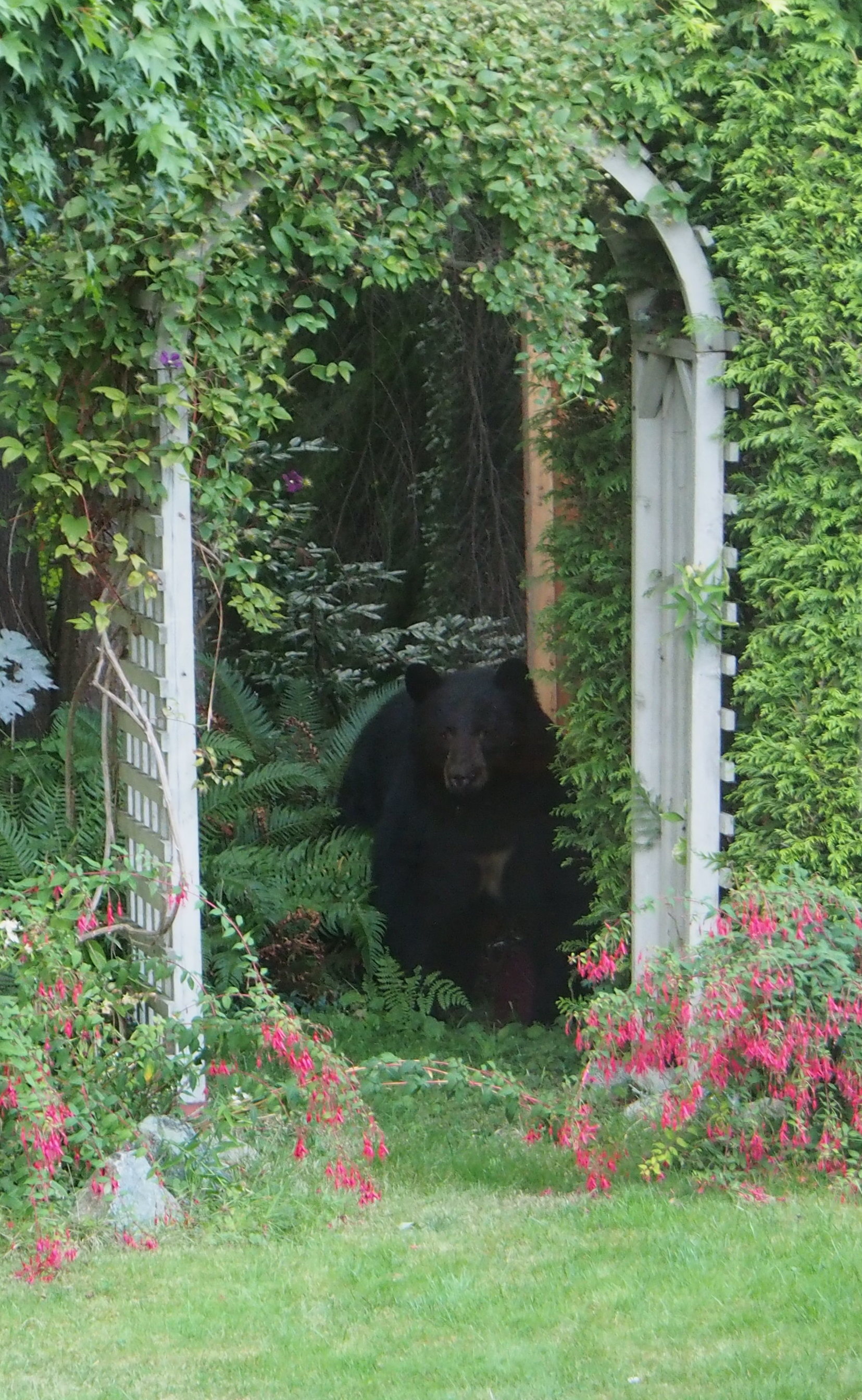 Hinter Silja ragen in die obere Bildmitte kleinere hellgrüne und größere dunkelgrüner Äste von Bäumen hinein. Neben Silja in unmittelbarer Entfernung sind kleine Büsche und kleinere Pflanzen. Dahinter in weiterer Ferne ist eine Wiese und der graue Weg, den sie später noch entlang gegangen ist. Diese Wiese wird von Bäumen in noch weiterer Ferne begrenzt. Ich kenne weder den Namen der Büsche noch kann ich die Bäume in der Ferne erkennen, um diese genauer beschreiben zu können. Über den Bäumen ist der strahlend blaue Himmel zu sehen. Dieser wird von oben nach unten heller und auf Höhe der Bäume ist er nahezu weiß.