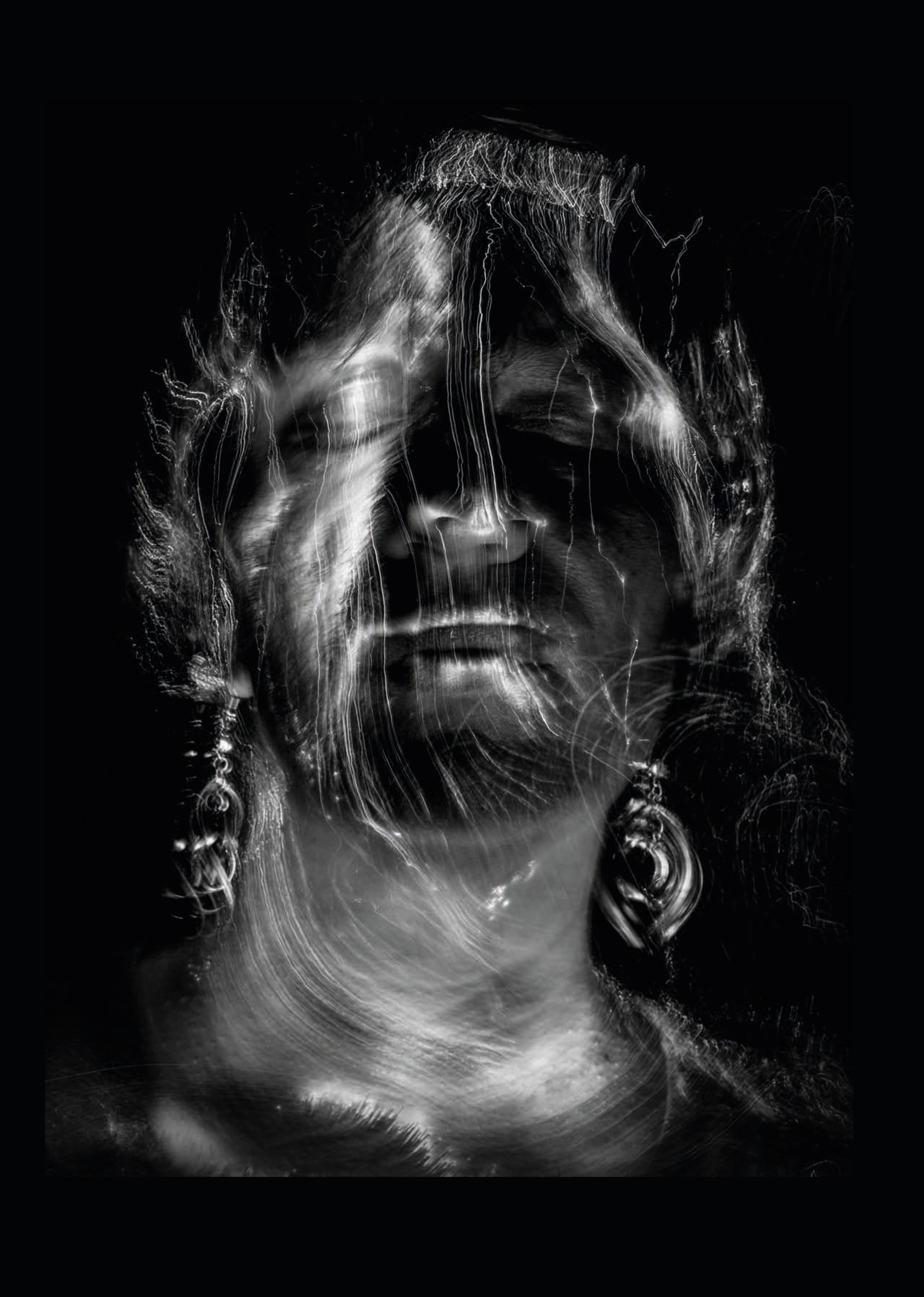 Wir sehen ein Lightpainting im Hochformat in schwarz-weiß. Vor schwarzem Hintergrund hebt sich ein menschliches Gesicht ab, dass mit hellen Lichtflächen sehr unterschiedlich beleuchtet wird. Das Gesicht ist frontal von Scheitel bis Hals und Schulteransatz abgebildet, die Augen sind geschlossen. Weisse Lichtstreifen fliessen wie Haare über das überwiegend schwarze Gesicht hinab. Der Hals ist heller beleuchtet und an den Ohren hängen ringförmige Lichtgebilde.