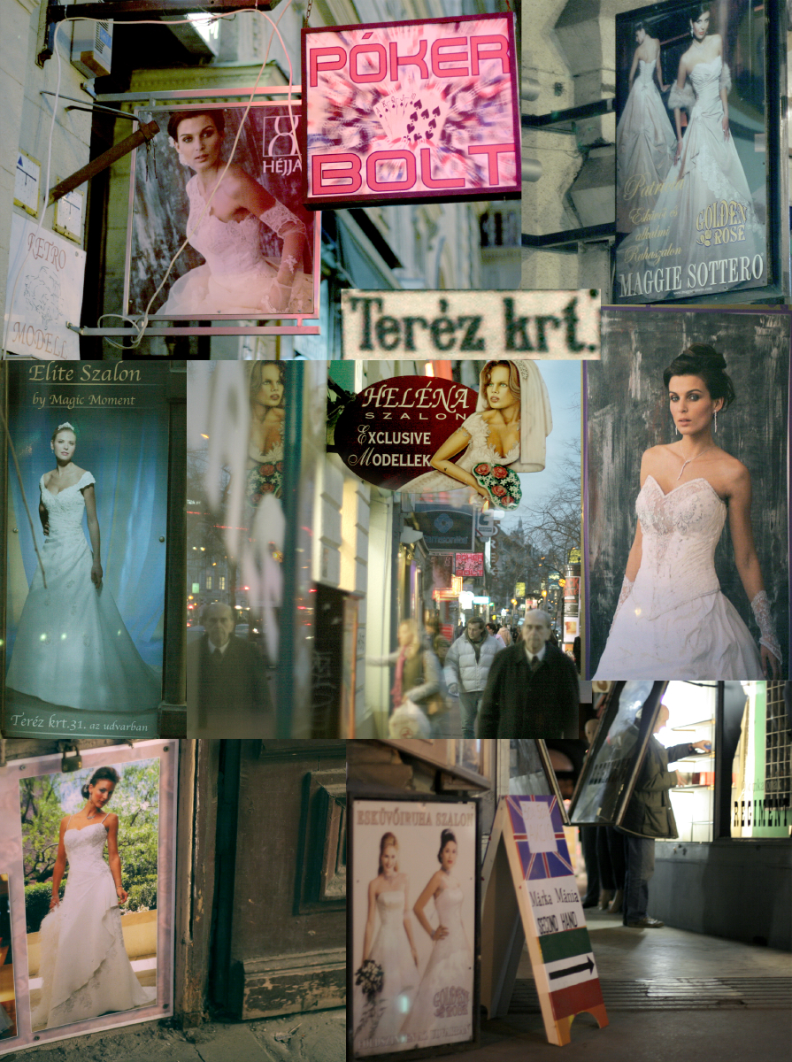 Mit dem zweiten Bild erschließt sich auch das erste: Es ist wohl ein Viertel in einer alten Stadt, wo Brautkleider angeboten werden. Hier hängen Dutzend ähnliche Fotos wie das erste mit jungen hübschen Frauen in lauter weißen Brautkleidern, dazu bunte Reklame, die vor der Hochzeit wohl Blumen ersetzt. Irgendwas in einer nicht sofort identifizierbaren Sprache steht auch darüber geschrieben – Tschechisch oder Ungarisch? Szalon Heléna Exclusive Modellek. Vor Vitrinen flanieren Menschen, es ist Spätherbst und es ist fast ganz dunkel.