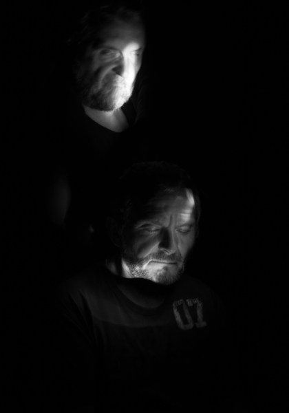 Das Bild ist ein Hochformat mit sehr viel Schwarz, aus dem zwei Gesichter im Halbprofil schauen. Beide sind auf die rechte untere Bildecke gerichtet . Das untere hat geschlossene Augen und einen sichtbaren kurzen Vollbart. Das zweite Gesicht schaut mit offenen Augen schräg nach unten und hat ebenfalls einen gestutzten Vollbart. Beide Gesichter werden von jeweils einem hellen Lichtstreifen erleuchtet.