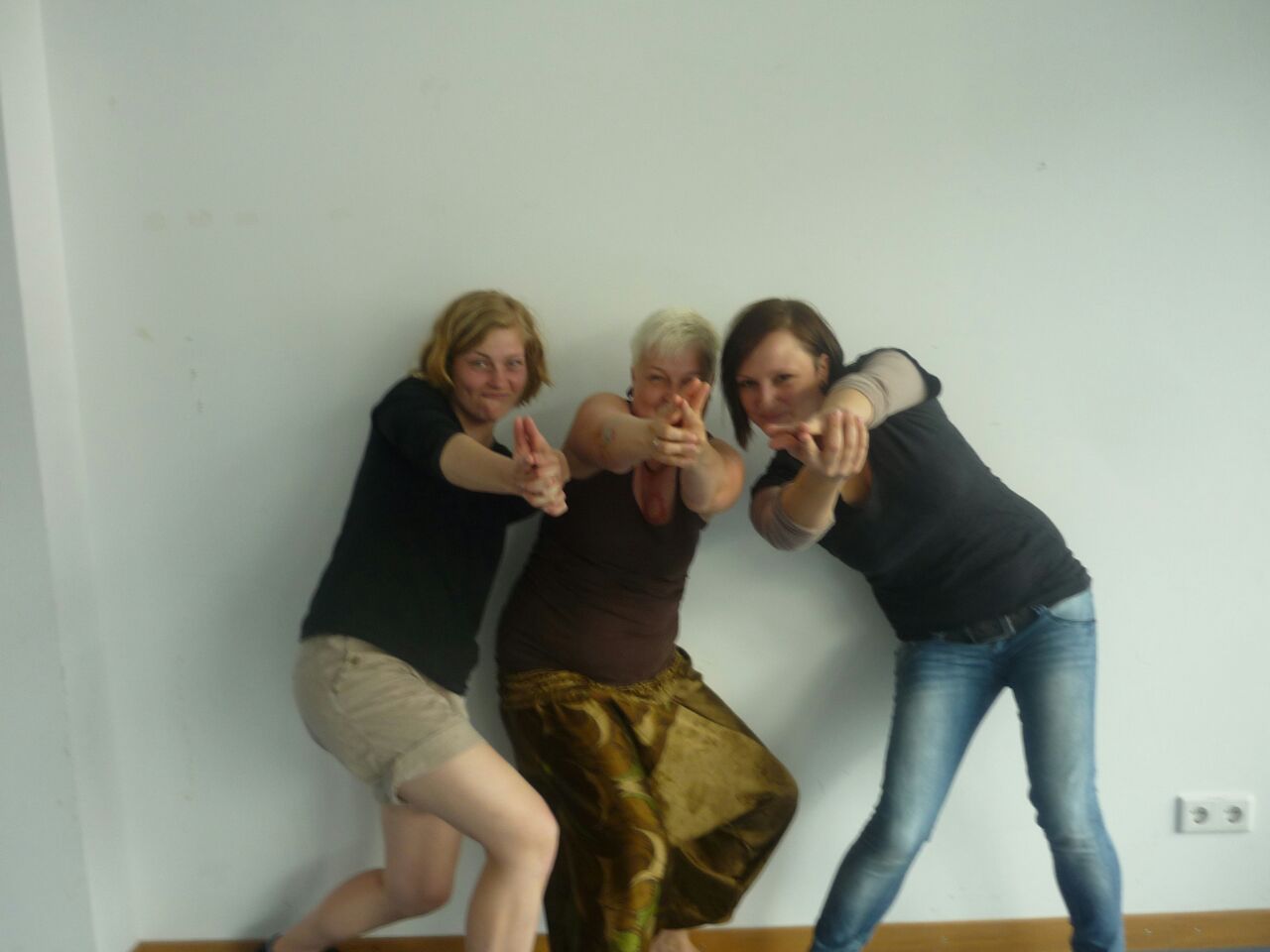 Auf dem Bild zu sehen sind 3 Frauen (Meike, Korinna und Julia), die vor einer weißen Wand posieren, wie die drei Engel für Charlie.