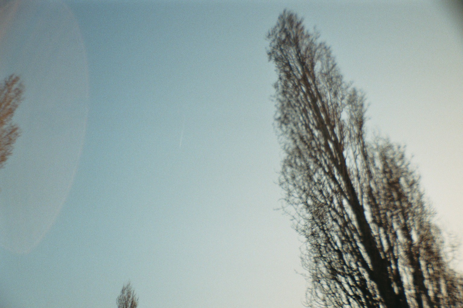 Dies ist erneut eine Aufnahme des Himmels. Das blau-weiße Unendlich nimmt die gesamte Bildfläche ein, durchbrochen wird es von drei kahlen Baumspitzen.