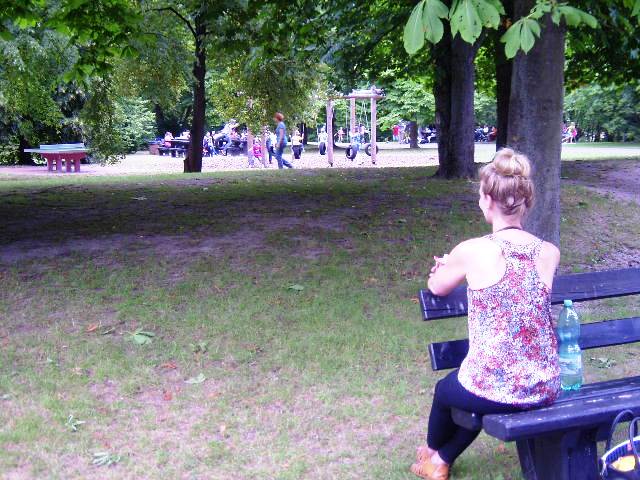 Die Fotografin hat sich nun ganz nach links gewendet und einen bisher noch nicht zu sehenden Teil des Parks aufgenommen. Außerdem ist die Aufnahmeperspektive aus mittlerer Höhe, so dass die Beine zweier Personen im Vordergrund erst ab dem Knie sichtbar sind.