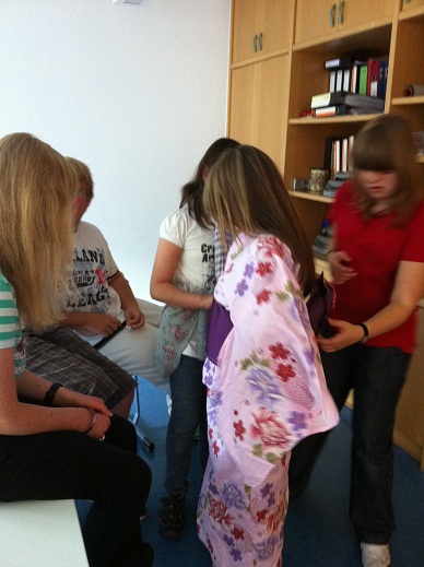 Der Gürtel bei einem Kimono ist etwas besonderes, er wird am Rücken zu einer Schlaufe geschnürt. Ich glaube die Kinder versuchen gerade die Schlaufe zu machen.
