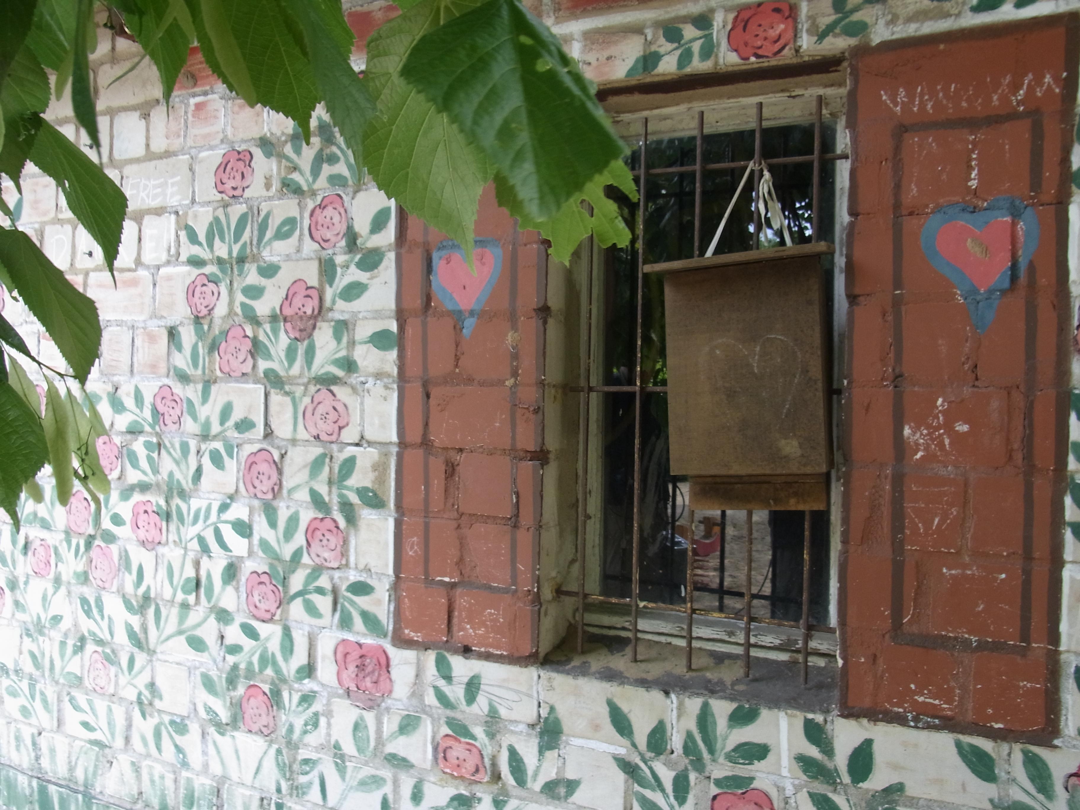 Die Backsteinmauer ist alt und von Wind und Wetter gezeichnet. In vergangenen Tagen einmal bunt bemalt worden, ist die Farbe nicht mehr kräftig und strahlend, sondern bereits von der Sonne ausgeblichen. Um das alte Holzfenster herum sind zwei braune Fensterläden aufgemalt, jeweils verziert mit einem roten, blau umrahmten Herzen. Sie heben die Tristesse des Fensters, mit seiner abbröckelnden Farbe und dem verrosteten Gitter, etwas auf.