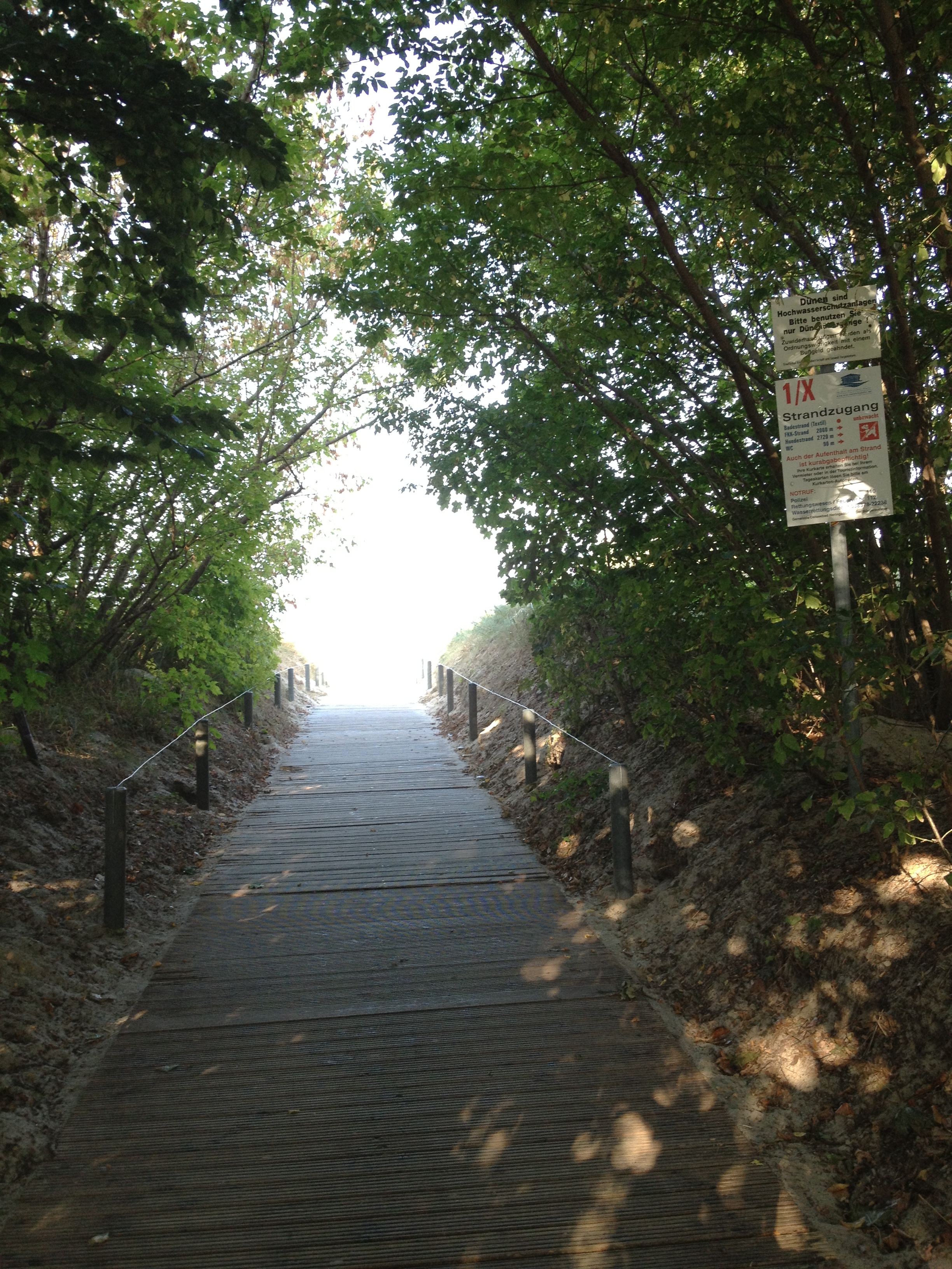 Der Bohlenweg sieht aus der Fotoperspektive ziemlich abschüssig aus. Das kann aber eine raffinierte Täuschung sein. Wahrscheinlich steigt er eher an, um dann hinter dem Wald in den offenen Dünen wieder abzusteigen. Jedenfalls gibt es keine Stufen an denen wir es sehen könnten. Er führt direkt ins gleissende Sonnenlicht. Da das Foto den lindgrünen Wald so gut belichtet, ist die Öffnung des Weges hoffnungslos überbelichtet. Streng genommen wissen wir nur deshalb, dass es zum Strand geht, weil du, Susanne, es uns mit der Überschrift verraten hast. Oder wenn wir uns die Mühe machen, das Blechschild zu entziffern, das im Vordergrund rechts neben dem Weg steht. Da steht nämlich alles Wichtige drauf, was man zu einem ordentlichen deutschen Strandaufenthalt wissen muss: Strandabschnitt, textil, keine Hunde, nächstes WC 50m nach rechts, Kurtaxenpflicht und noch einiges mehr. Darüber noch ein kleines Schild, das uns ermahnt, nur diese schönen Holzwege zu benutzen, weil die Dünen Hochwasserschutz bilden. Zuwiderhandlung kostet sogar Bußgeld! Damit es niemand aus Versehen macht, ist weiter vorn links und rechts vom Weg in Kniehöhe ein Draht gespannt.