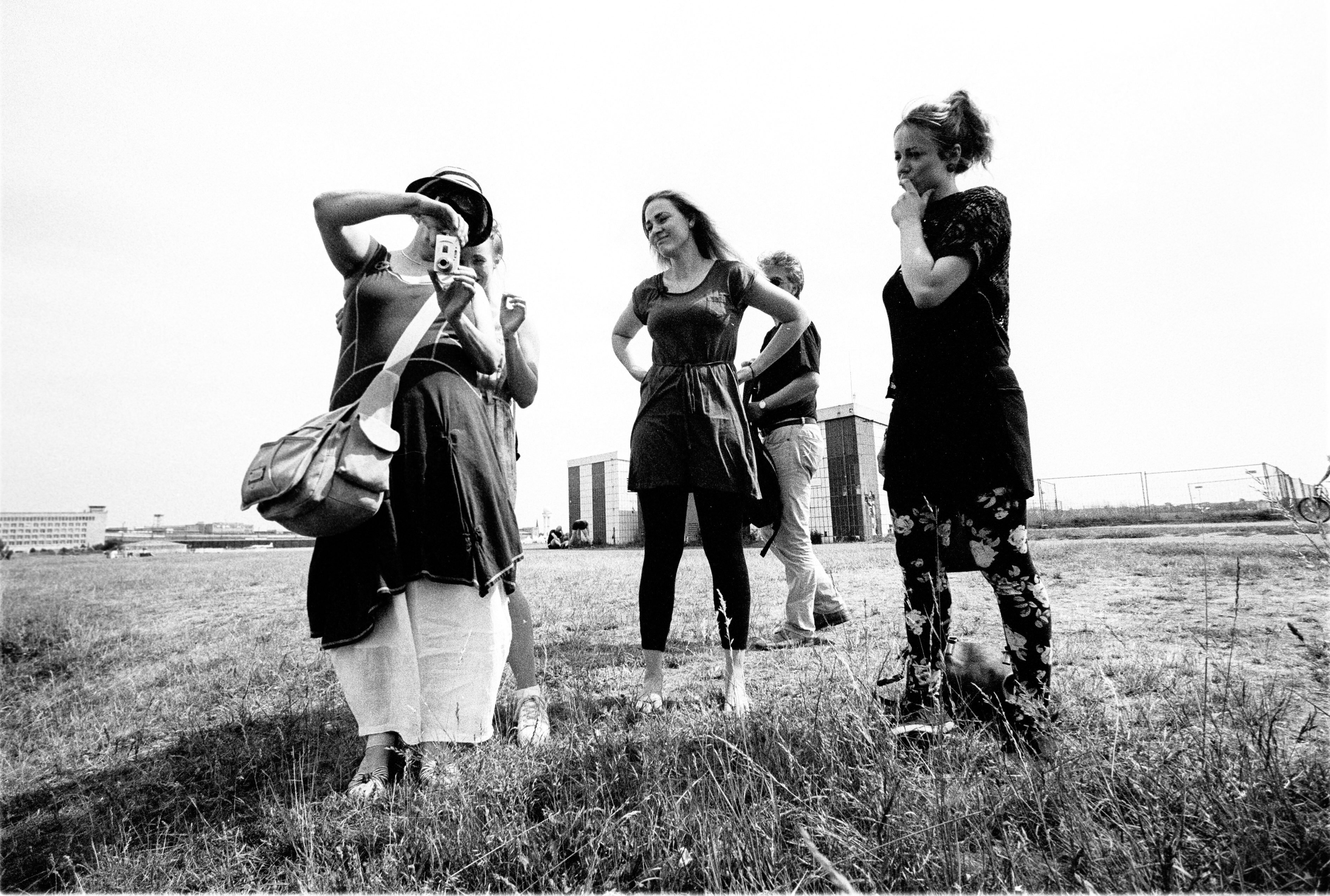 Hinter ihr im Bild ist eine große grüne Wiese, vereinzelt mit Blumen. Rechts von ihr, etwa 2 Meter entfernt steht ein Mensch mit einer Kamera. Er filmt diese Fotoaufnahme und zielt mit der Kamera direkt in das Bild der Betrachtenden. Die Kamera, die er mit beiden Händen umschlingt und vor sein Gesicht hält, besteht aus einem großen Objektiv und einem darüber ragenden Mikrofon. Er trägt einen grauen Pullover und eine Umhängetasche um den Brustkorb ist sichtbar.